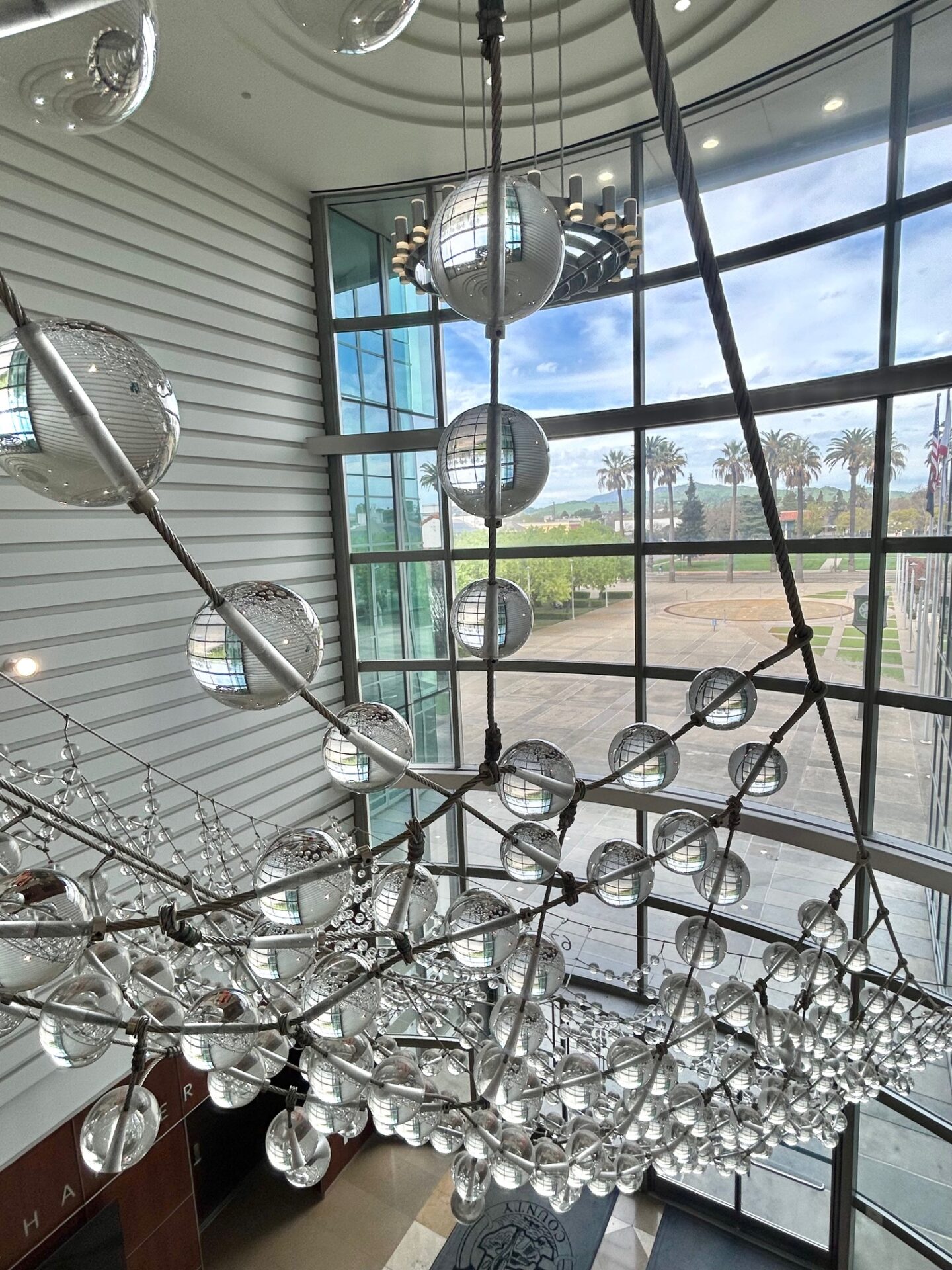 High above the entrance hall of the Solano County Government Center in Fairfield, California, I am restoring the sparkle of my 2005 suspended glass installation, “of Capturing a Moment.”