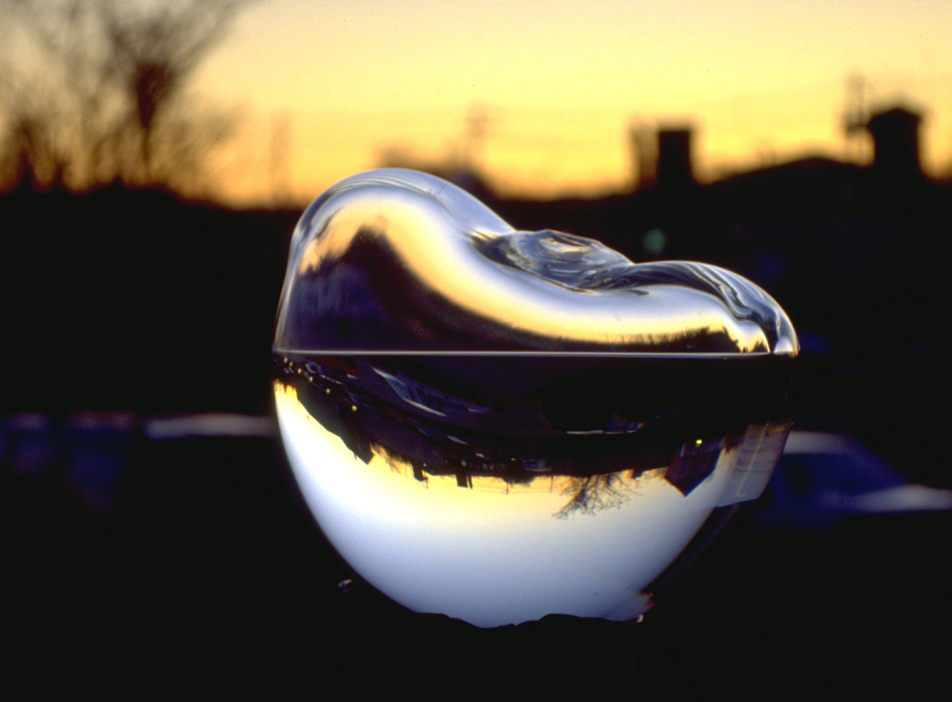 Aqueous Series explores optical perception through hand-sculpted glass lenses embedded in frosted Plexiglas. Each optically clear lens was individually fabricated by the artist, moving from shaping hot glass to cold-working processes of grinding and polishing.