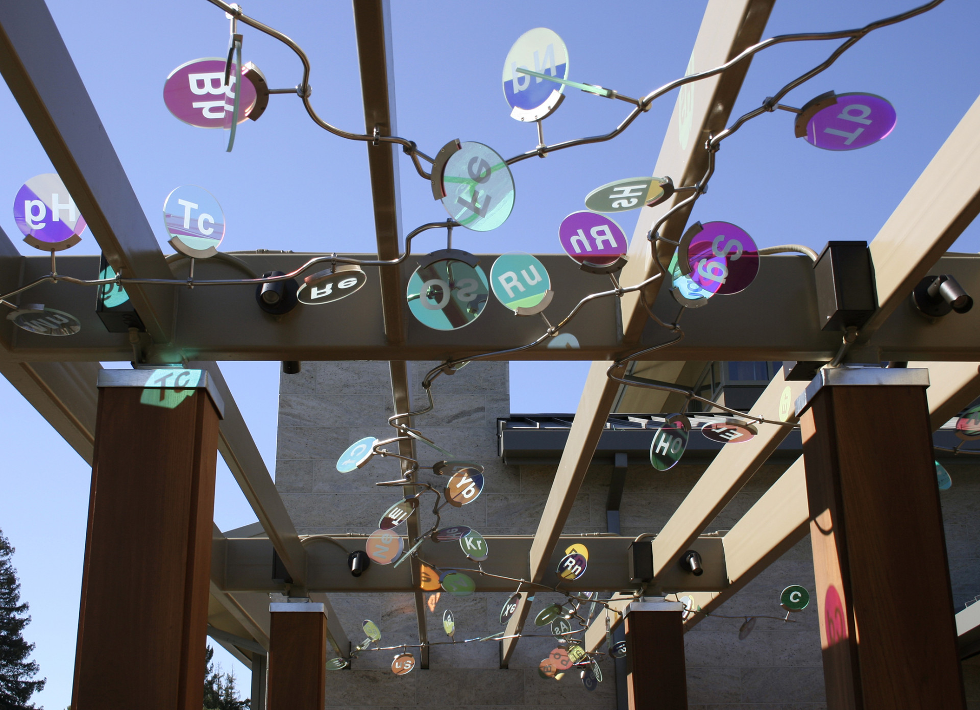 The letters from Periodic Tables of the Elements are represented within each 109 colored glass circles. Organic pattern of stainless steel armature is inspired by the creek pattern in the city of Lafayette, supporting the hanging glass elements.