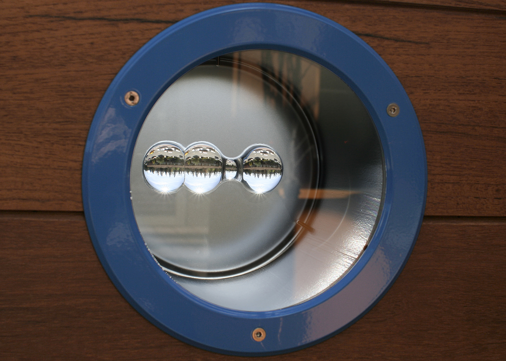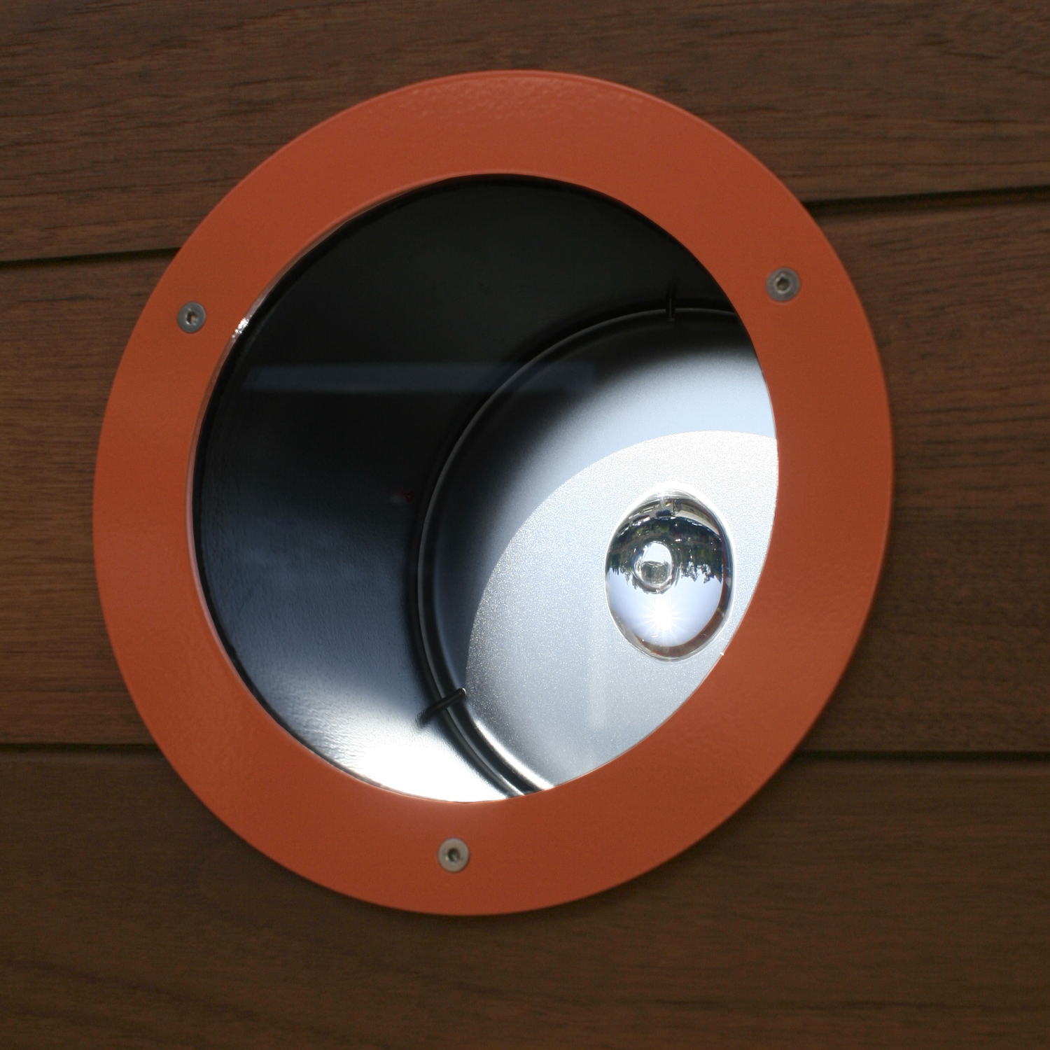 Handmade optical lenses, suspended in plexiglas panels, capture people in the background or the landscape beyond the deck wall, showing upside-down/reversed views.