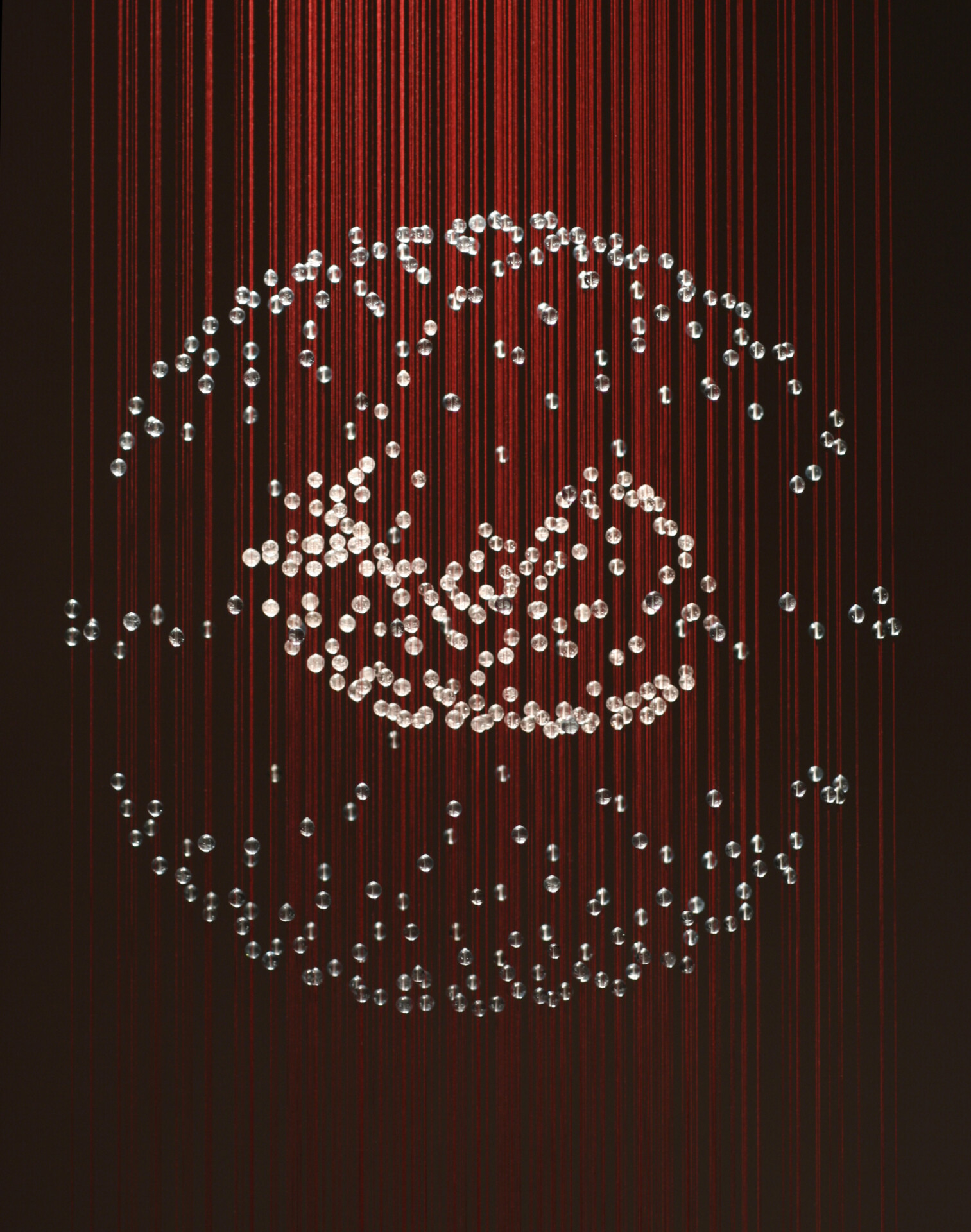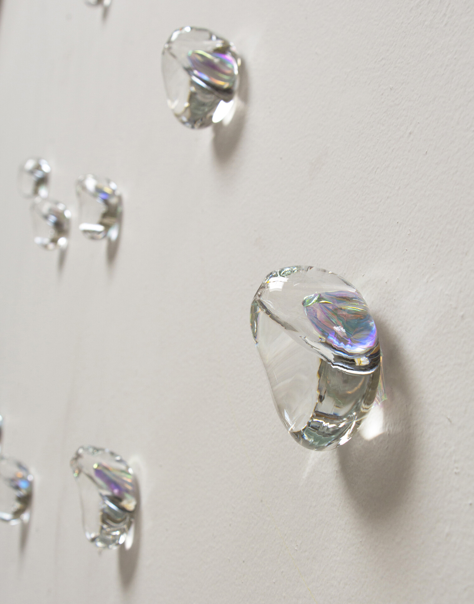 Techniques are hot glass and lampworking. These glass elements become the vocabulary for the spatial compositions. Glass elements are often suspended by thin stainless steel cable — with the exception of one piece, Expectations (2011), which used red fabric thread — or installed individually, directly on the wall.