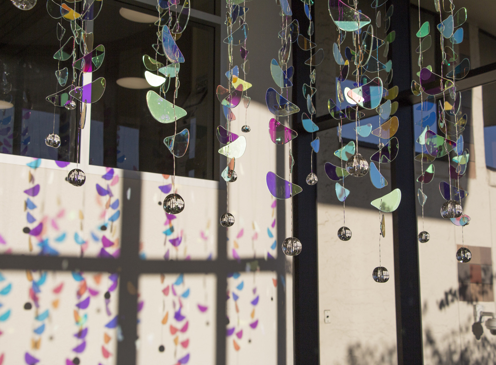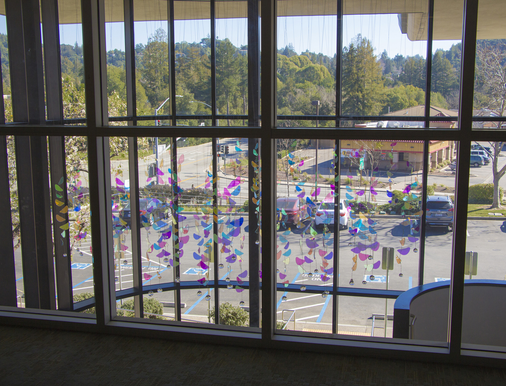 Inspired by the wildflower fields and forests of the local hillside, this installation evokes the experience of encountering nature. In the two-story entry lobby, a suspended glass flower field comprises over 500 dichroic glass petals woven vertically, each ending with a clear blown glass droplet.