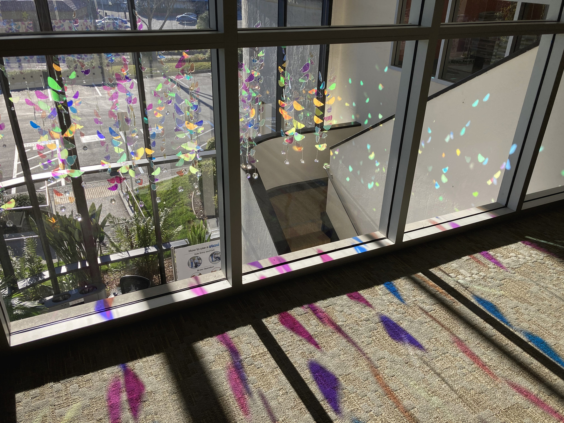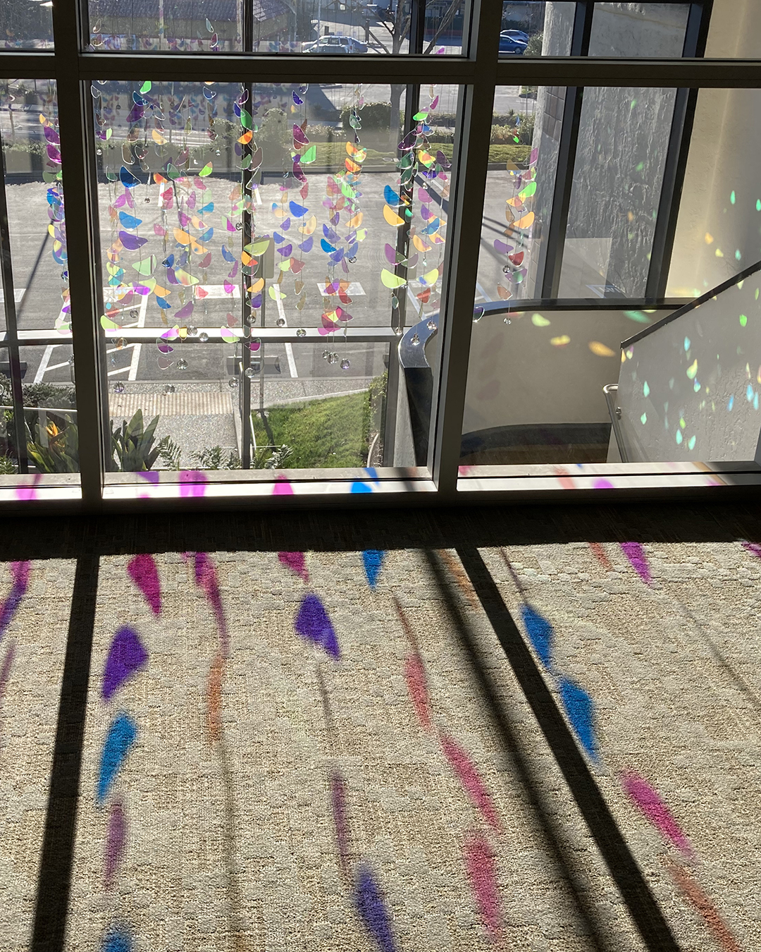 When the first sunbeam filters through the floor-to-ceiling curtain wall, the dichroic petals ignite into a vibrant light show. As visitors enter, hundreds of luminous reflections in shifting, multi-colored hues appear throughout the space—most vividly on the south-facing white wall and the walls surrounding the stairway—fluttering gently like butterflies, animated by the building’s subtle natural vibrations. Simultaneously, deeper, saturated shadow patterns of the petals are projected onto the curved upper wall beneath the interior window to the right. This interplay of reflections and shadows transforms the lobby into a living field of color, revealing a dimension of the artwork visible only at sunrise.