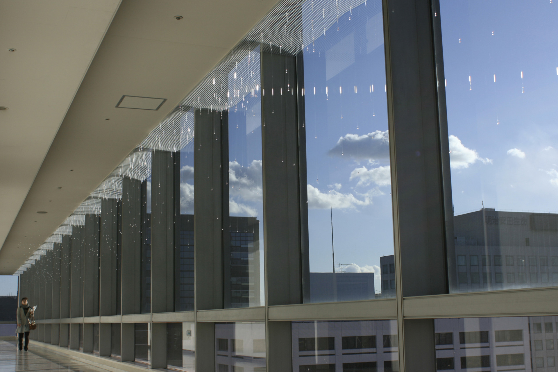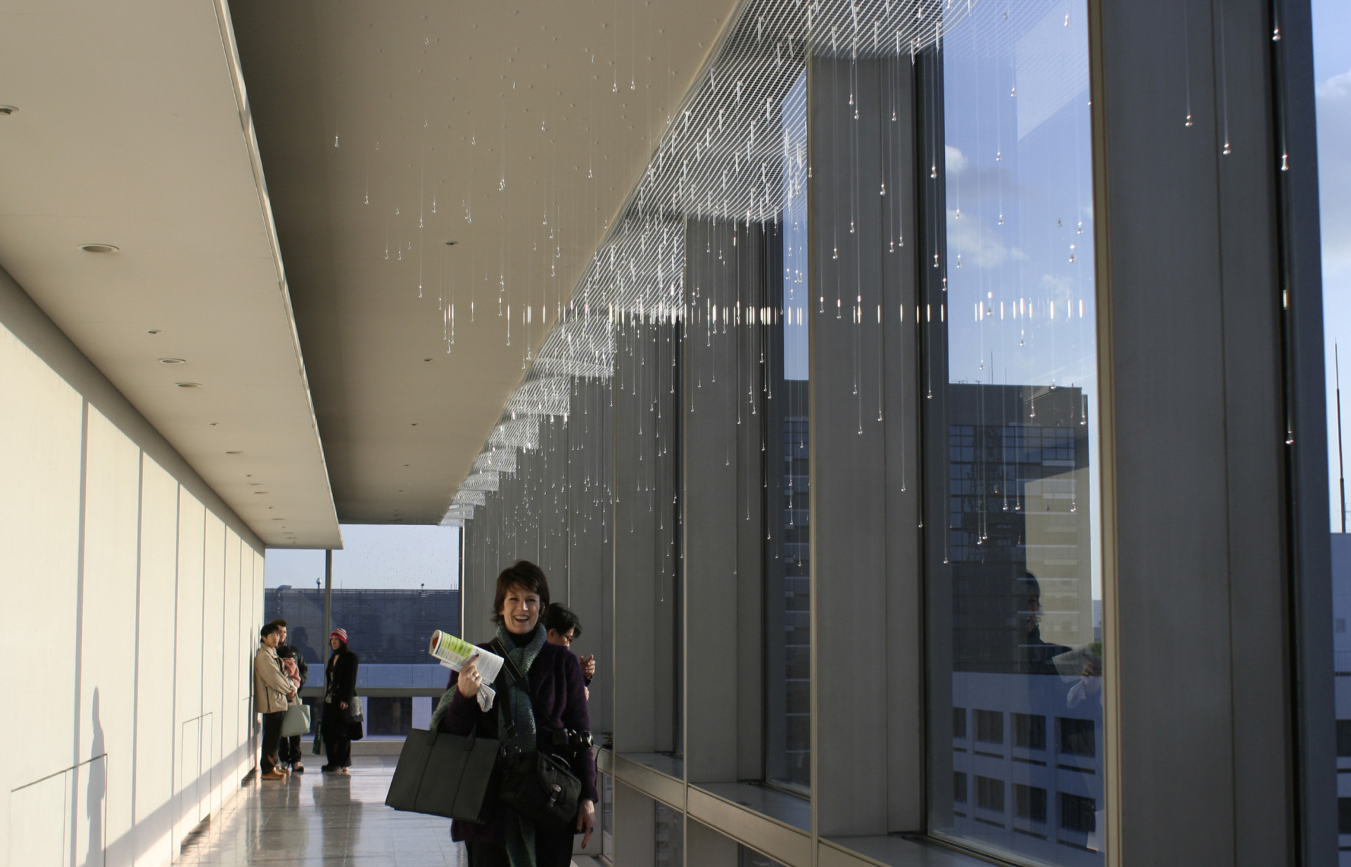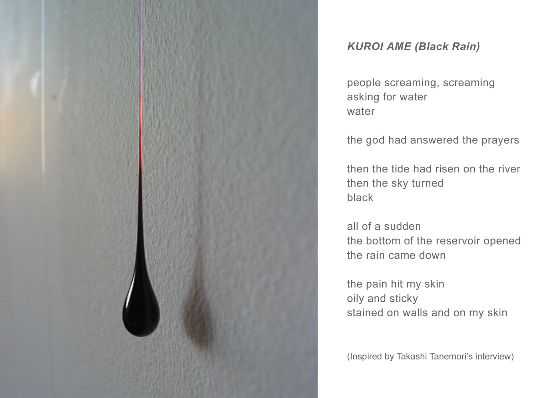 Most installations use clear glass. One exception, Ghosts of Little Boy (2005) at the National Japanese American Historical Society, San Francisco, CA, is made of black glass to reference Hiroshima and the Black Rain.