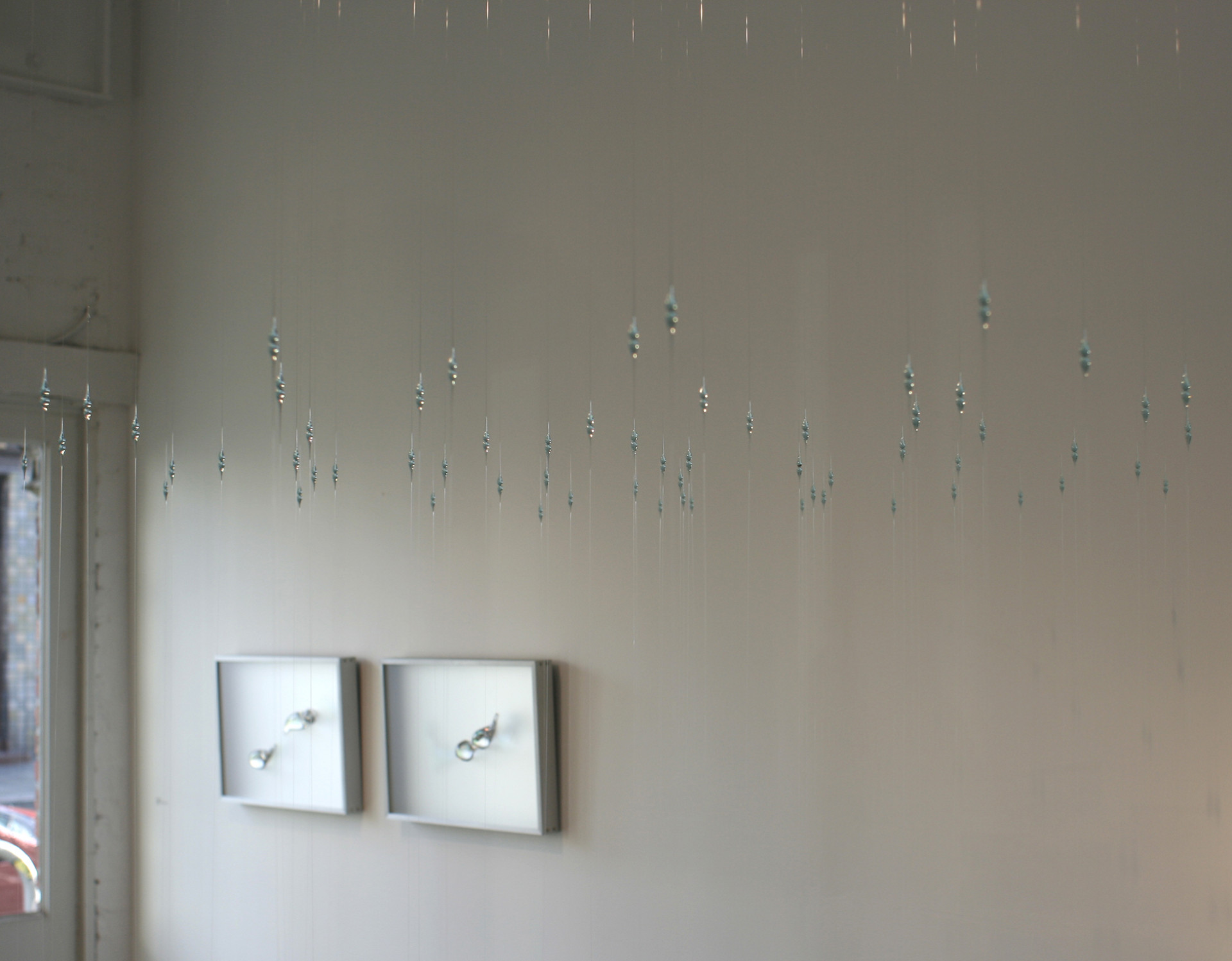 The Raindrop Series explores the ephemeral, luminous qualities of falling water through suspended glass. Using a torch atop a tall ladder, the artist melts the ends of clear borosilicate glass rods on site, allowing them to drip and stretch into delicate, elongated forms that capture a “frozen moment of rain.” Each element is suspended by its own trailing glass strand, creating immersive environments of light, reflection, and motion.