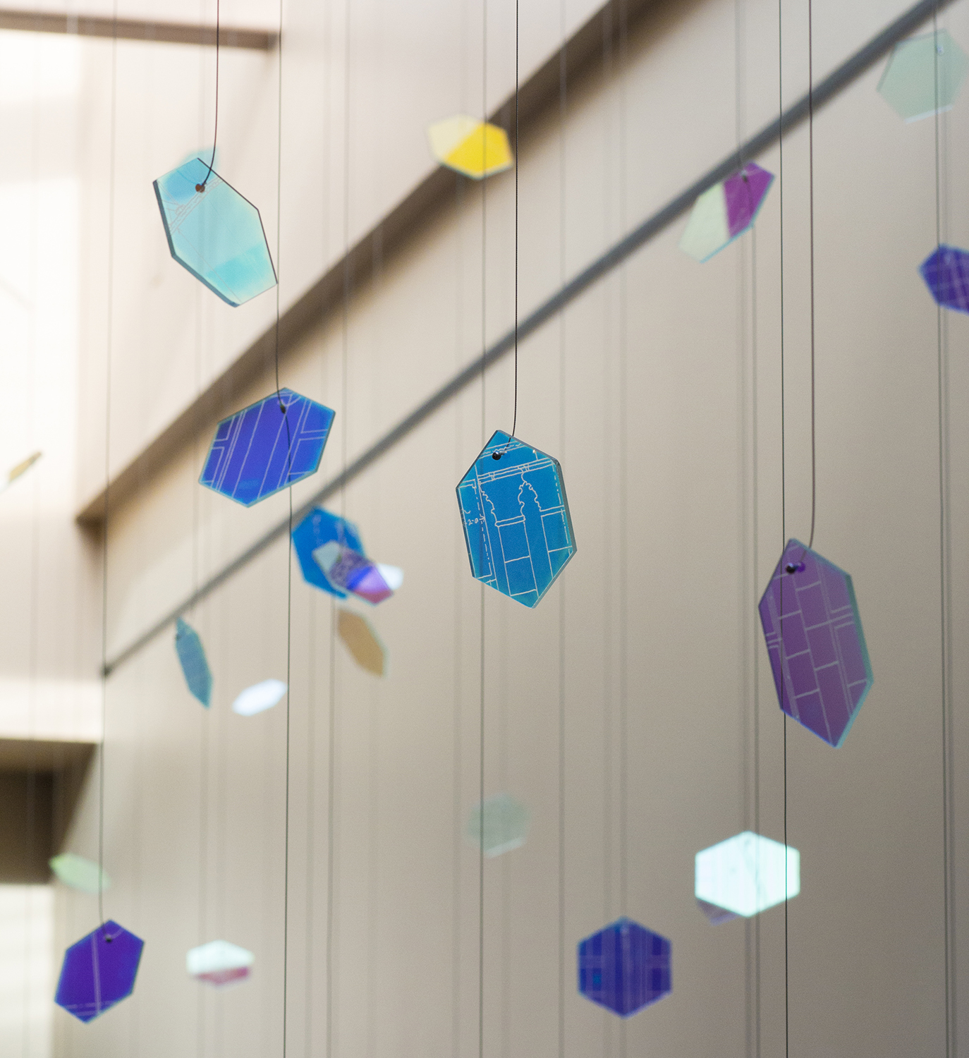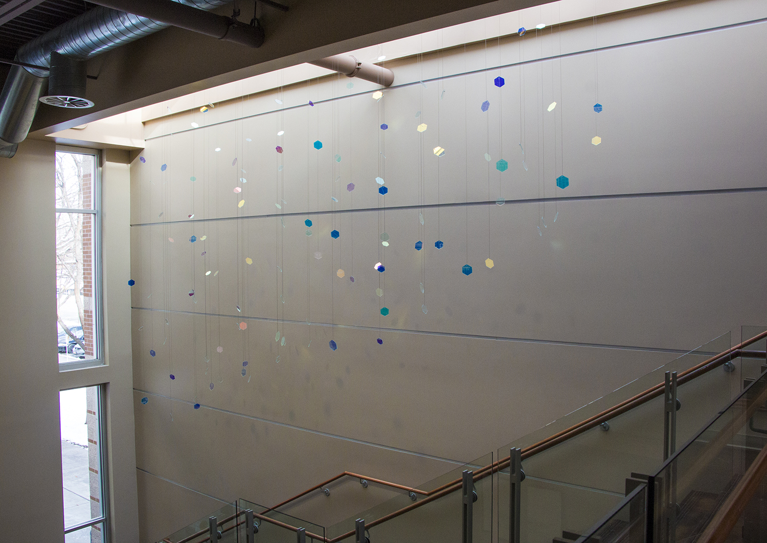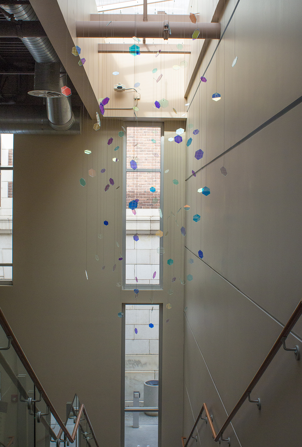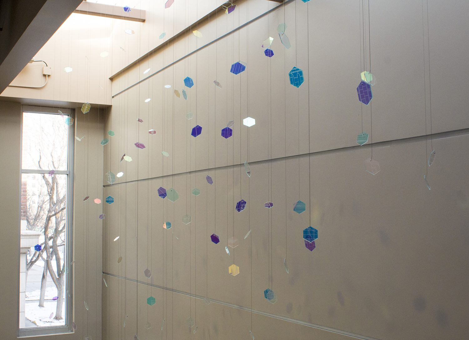 By choosing the material for each fragment to be the special ‘dichroic glass,’ I wanted to utilize the natural daylight flooding from the skylight. The interaction between the movement of daylight and the dichroic hexagon pieces creates an ever-changing visual experience for visitors and resident archivists by projecting colored patterns on the wall above the stairway that can be seen throughout the foyer.