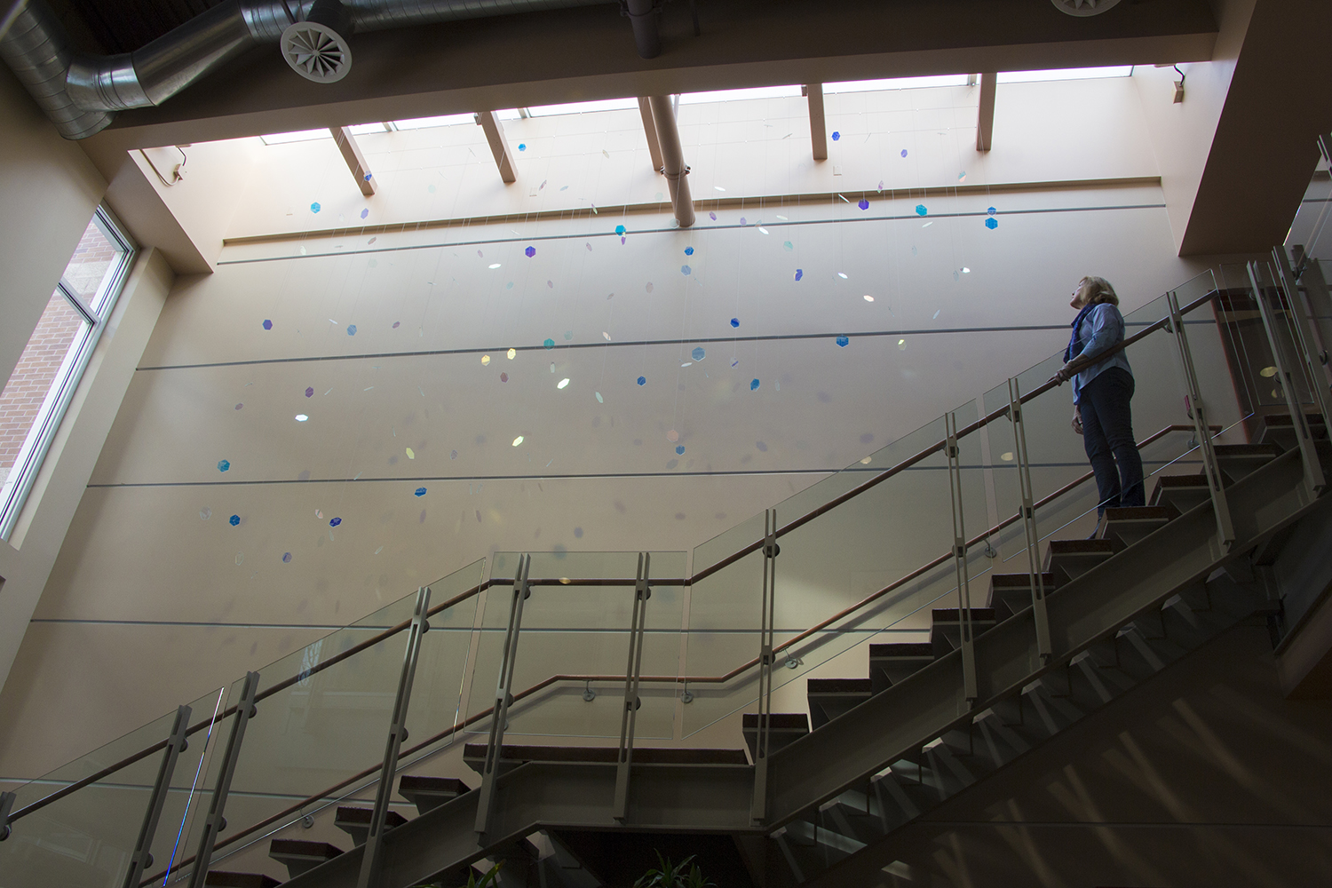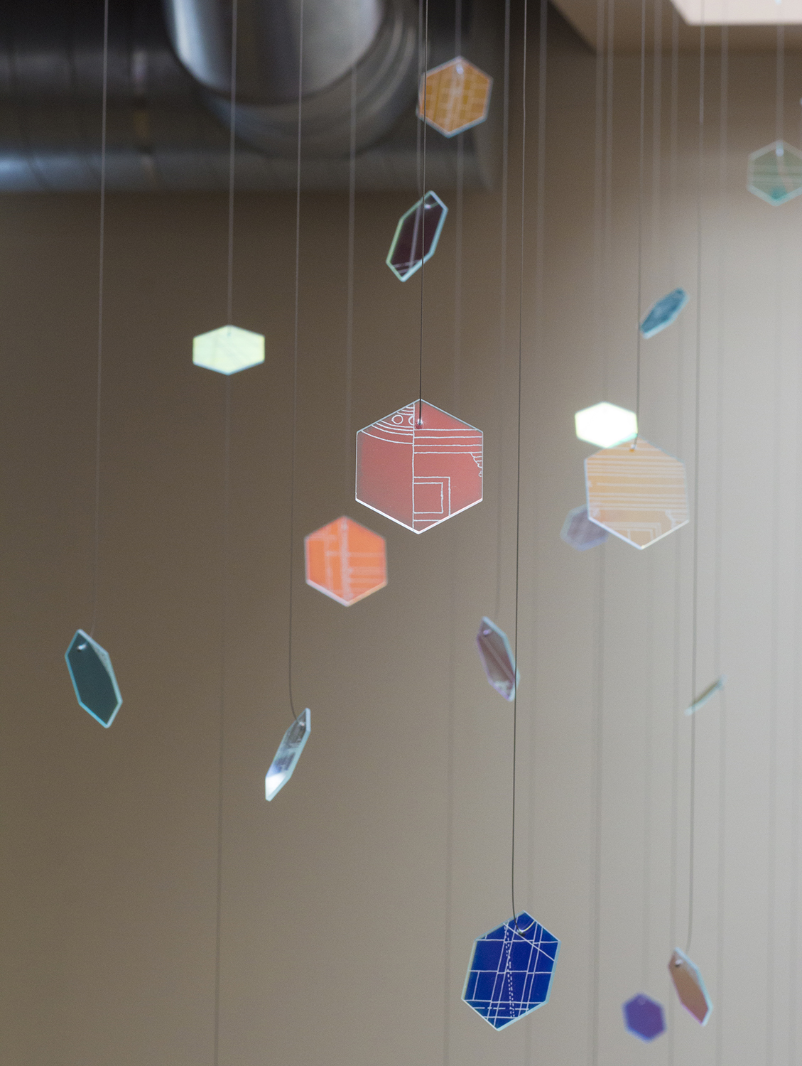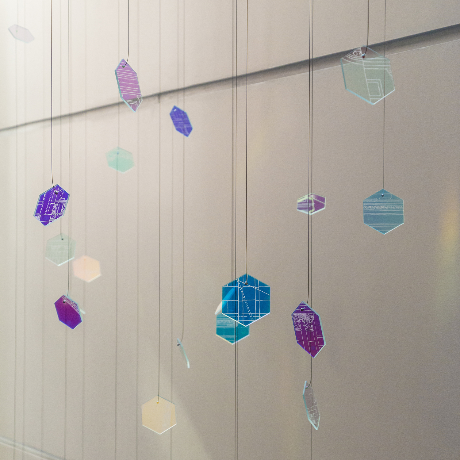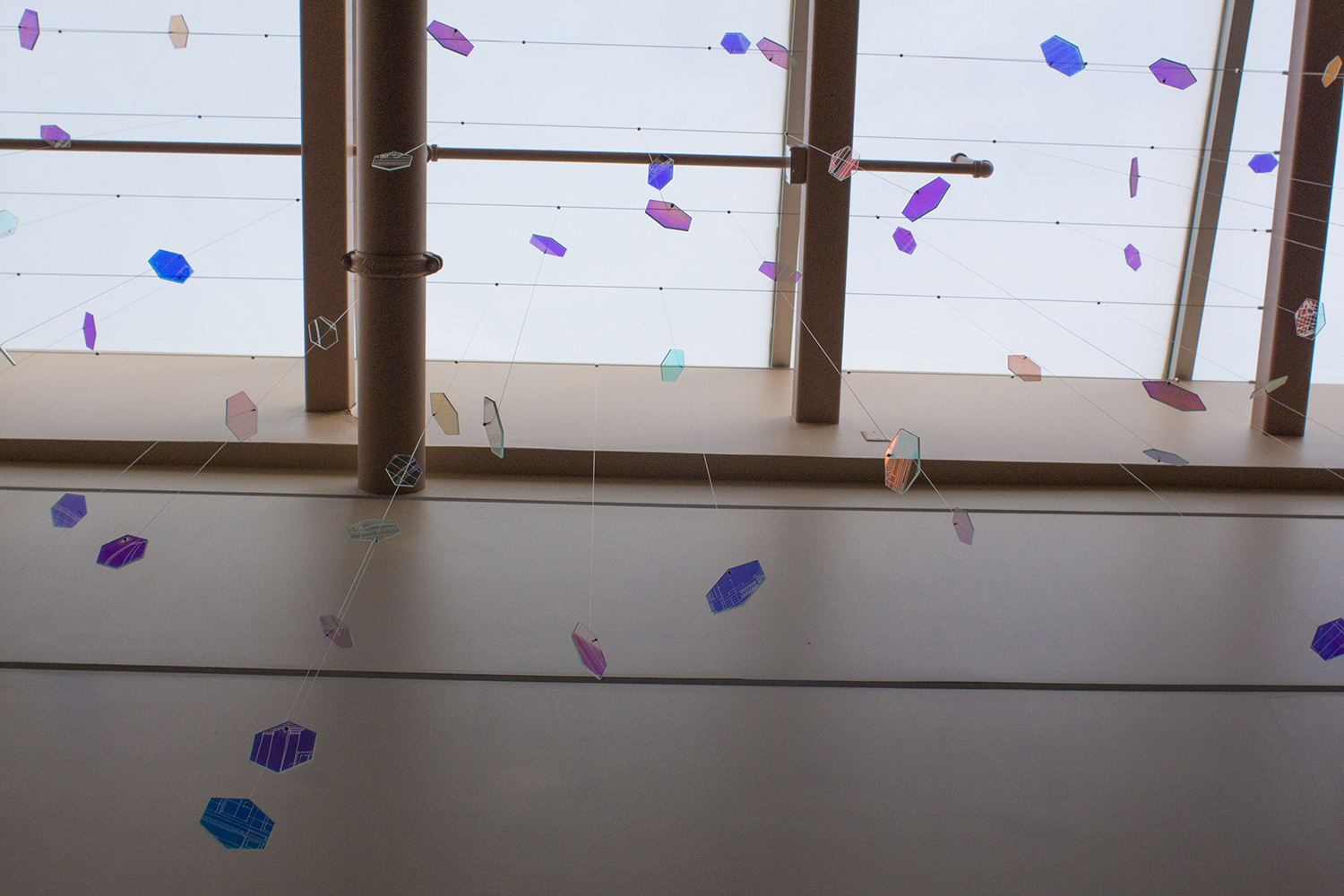 By choosing the material for each fragment to be the special ‘dichroic glass,’ I wanted to utilize the natural daylight flooding from the skylight. The interaction between the movement of daylight and the dichroic hexagon pieces creates an ever-changing visual experience for visitors and resident archivists by projecting colored patterns on the wall above the stairway that can be seen throughout the foyer.