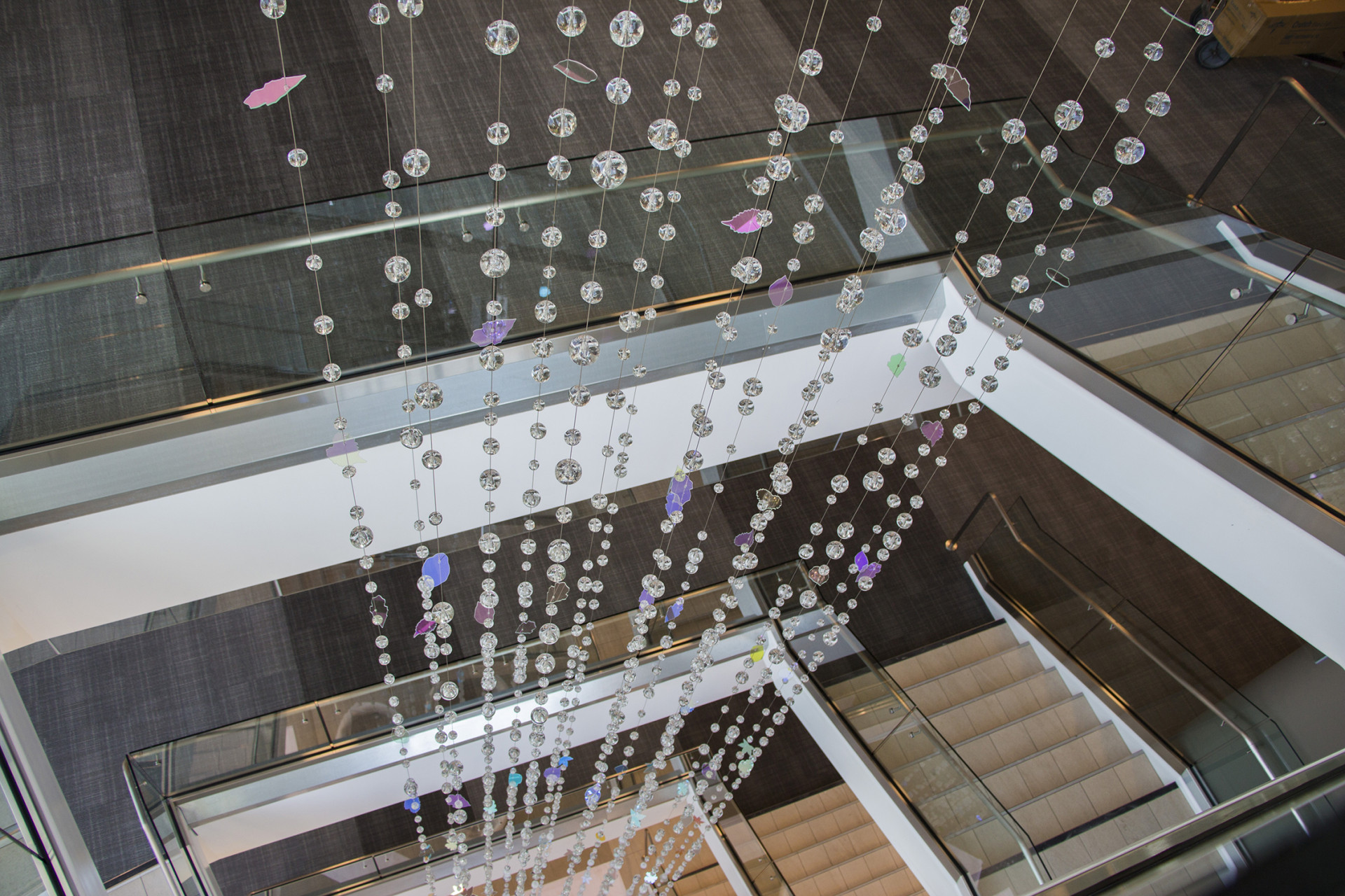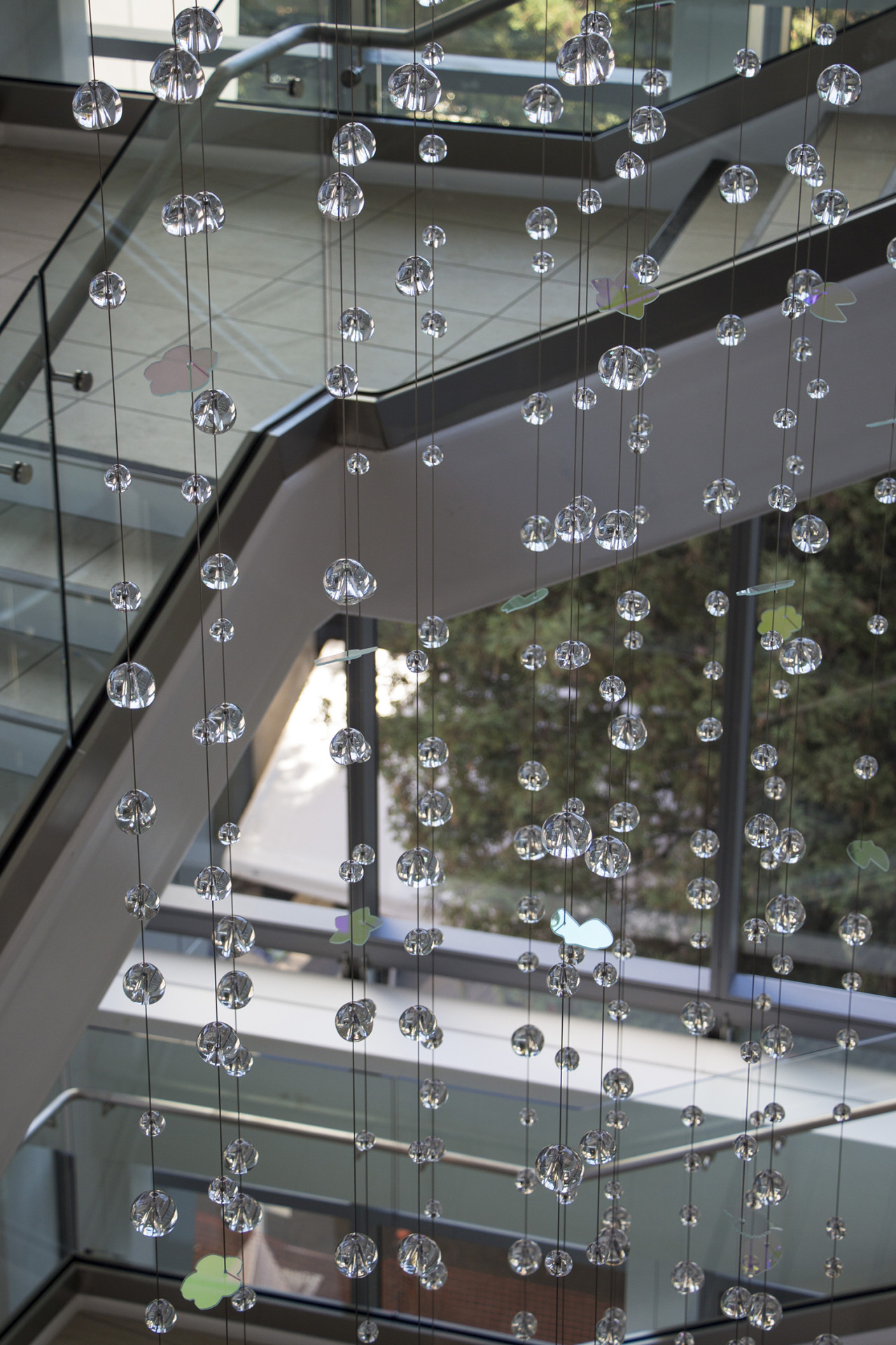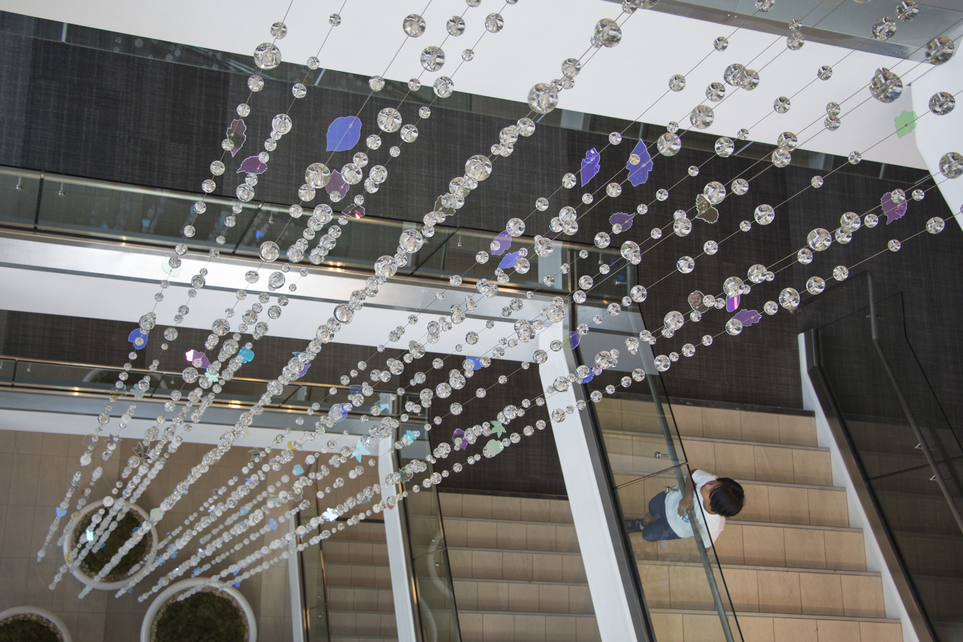 It begins with clear glass droplets depicting the pure crystal waters at its source. Undulating gently, multicolored petals reflect Roseville’s plethora of native leaves and flowers. Streaming downward in dance, clear droplets become filled with tiny bubbles as they plunge five stories to the bottom. To represent the evolution and dynamics of water drops that form a waterfall, Tanaka used the hot glass technique to hand-sculpt all the clear and bubble-filled droplets.