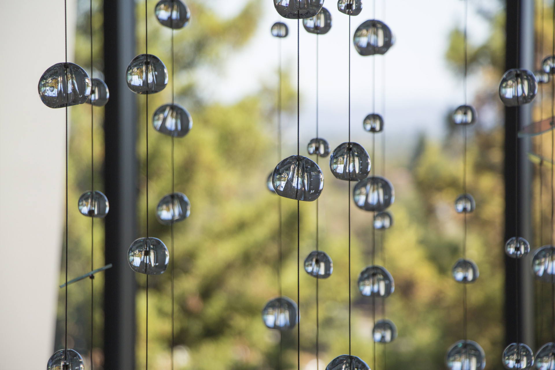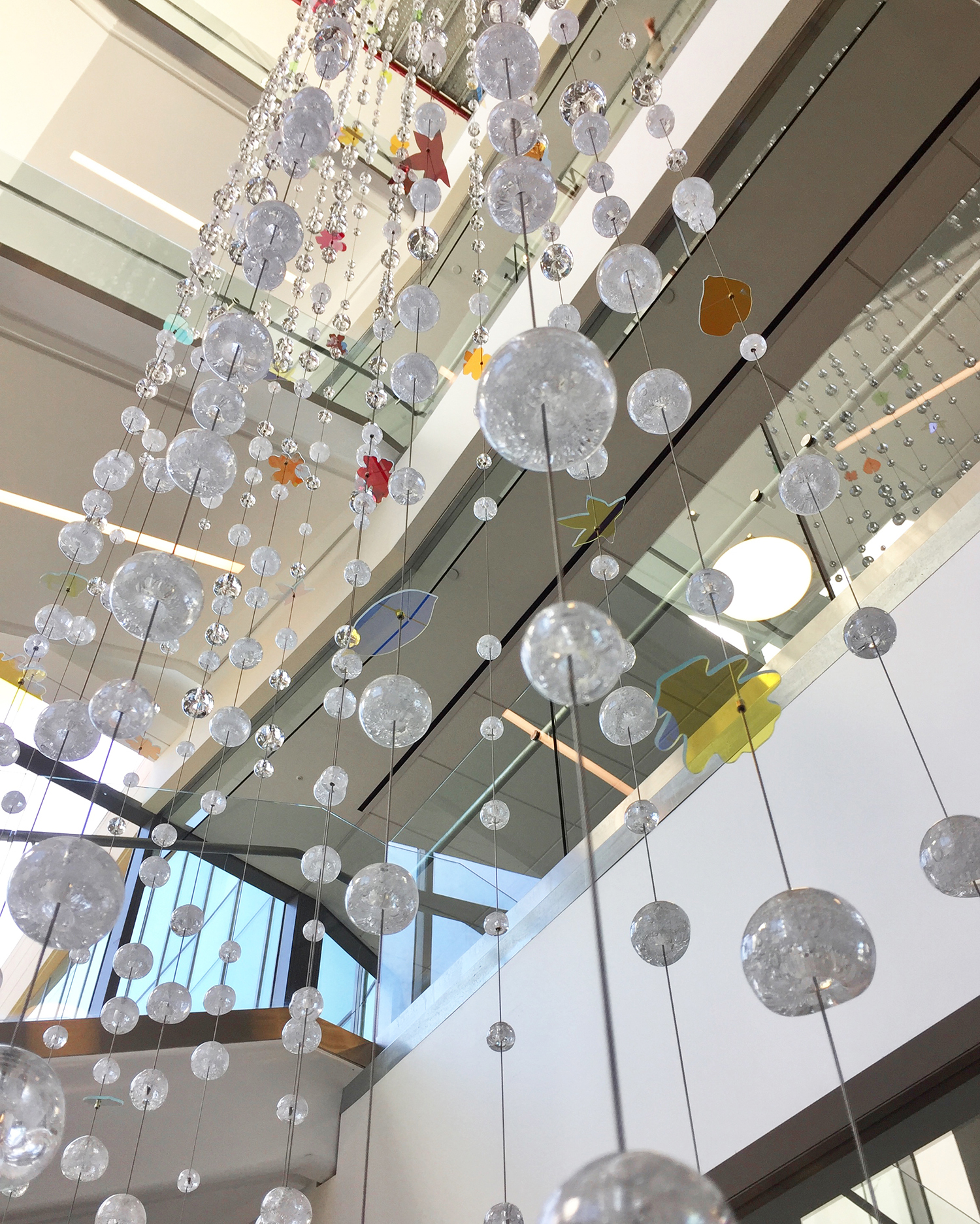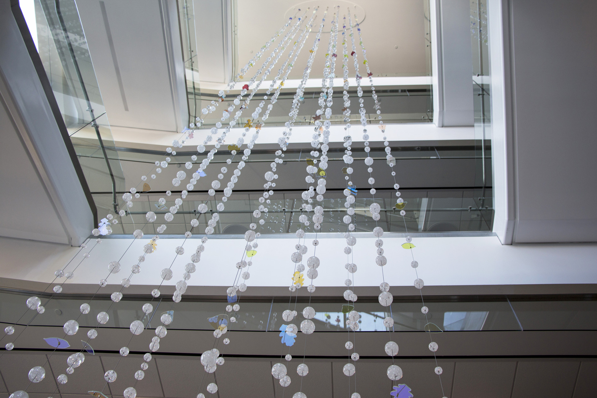 It begins with clear glass droplets depicting the pure crystal waters at its source. Undulating gently, multicolored petals reflect Roseville’s plethora of native leaves and flowers. Streaming downward in dance, clear droplets become filled with tiny bubbles as they plunge five stories to the bottom. To represent the evolution and dynamics of water drops that form a waterfall, Tanaka used the hot glass technique to hand-sculpt all the clear and bubble-filled droplets.